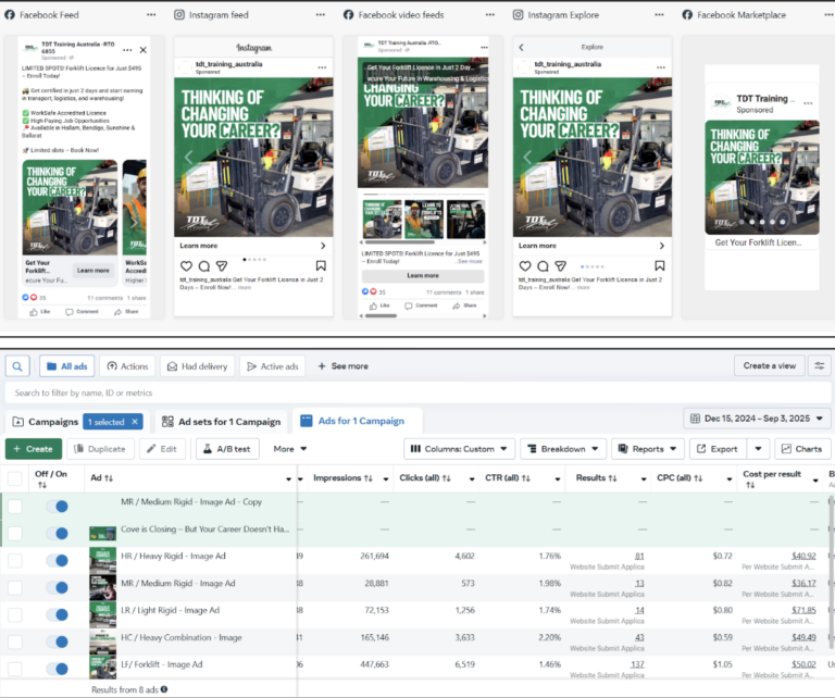 The results not only showcased TDT’s strong brand presence but also validated the effectiveness of a well-structured, multi-course Facebook Ads strategy. The campaign enabled TDT to consistently attract motivated students and reinforce its standing as a top provider of accredited heavy vehicle and business training programs in Australia.